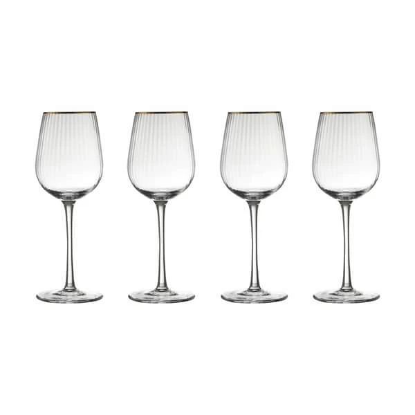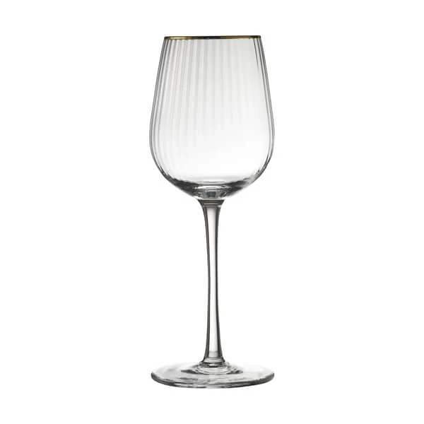 Nyd en lækker hvidvin i dette smukke hvidvinsglas fra Lyngby Glas. Hvidvinsglasset er elegant med et riflet design og en fin guldkant, hvilket tilføjer et flot vintagelook til glasset, samtidigt med at det afspejler tidens trends.
