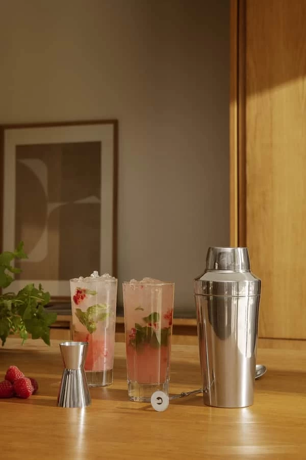 Den stilrene shaker i rustfrit stål er en helt uundværlig del af hjemmebaren, der gør det til en fornøjelse at mikse drinks både før og efter maden. Shakerens låg kan bruges som målebæger.